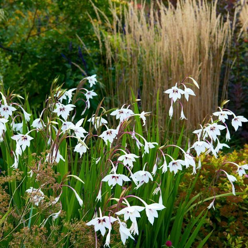 Цветы ацидантеры нежны и напоминают порхающих бабочек. Крокосмия образует изящные куртины с яркими, но не громоздкими соцветиями. Эти растения лишены монументальности гладиолусов, лучше вписываются в композиции, сочетаясь со злаками, котовником, розами, и органично смотрятся в садах природного стиля.